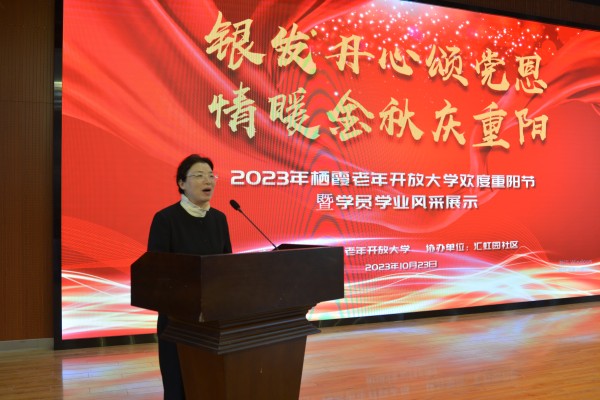 谷雨娥副校长致欢迎词。她向老年学员致以节日的祝贺,同时表示,希望老年朋友能在老年开放大学老有所学,学有所乐,最终学有所成,回馈社会。